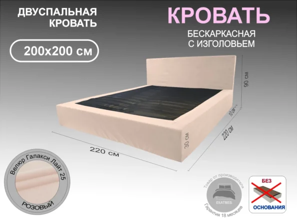 Кровать Бескаркасная, 200×200, бескаркасное, Велюр Галакси лайт 25-светло розовый, Ножки Без ножек Чехол на царгах НЕ съемный, Упаковка в картон,.