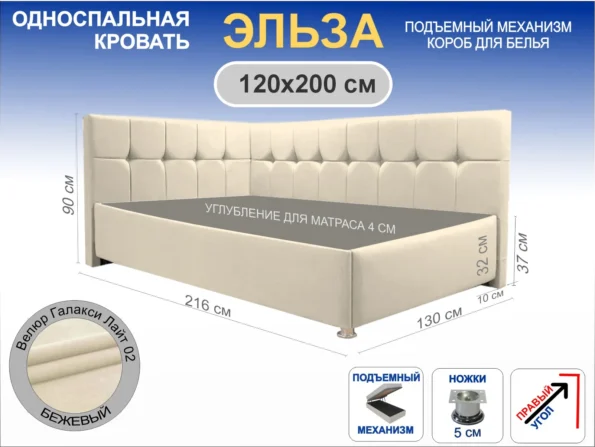 Кровать Эльза, 120×200, Подъемный механизм полное дно с полкой, Велюр Галакси лайт 02-бежевый, Ножки 5 см стандарт, Угол Правый — длинное изголовье справа Чехол на царгах НЕ съемный,.