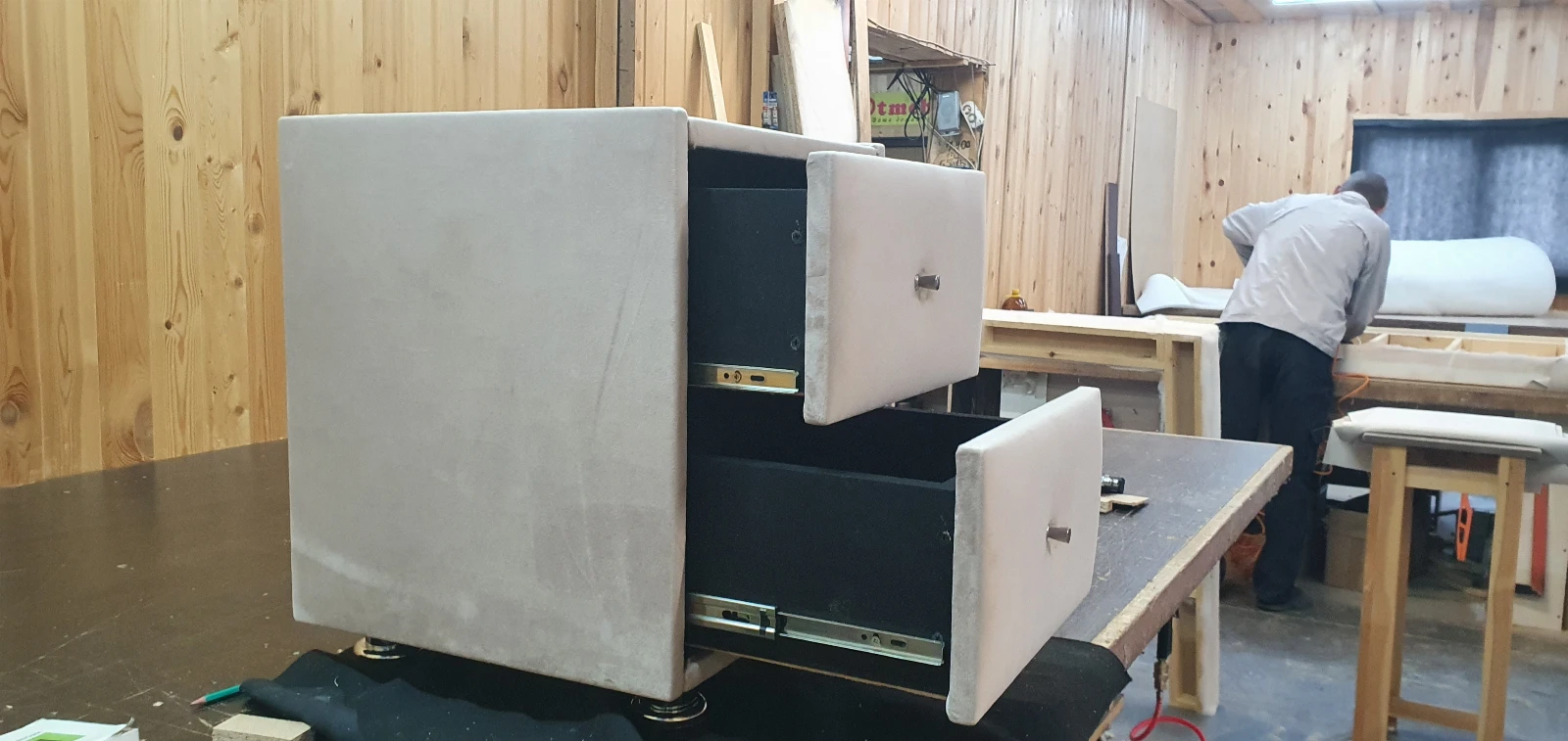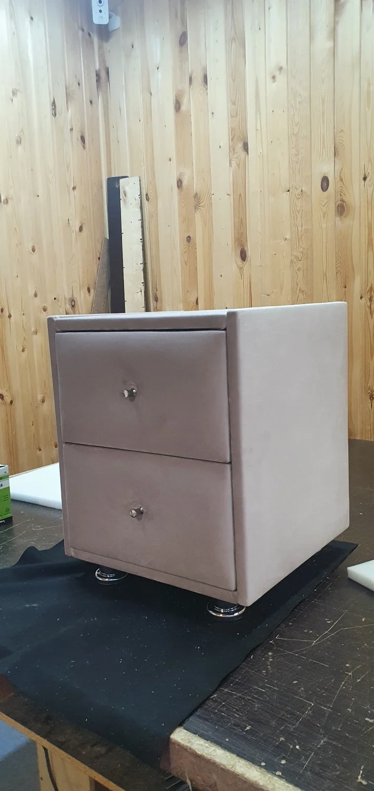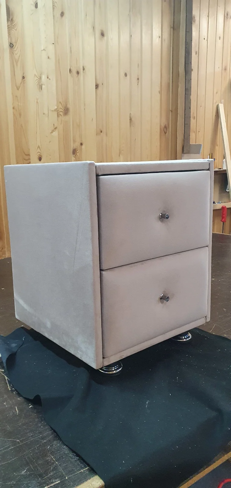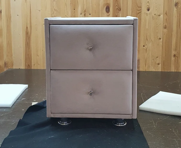 В наличии Прикроватная тумба 2 ящика, Велюр Бэлла 9-светло-бежевый,  400х400х500 Ножки хром. Небольшие потертости. Стояла на выставке в магазине. Без стекла