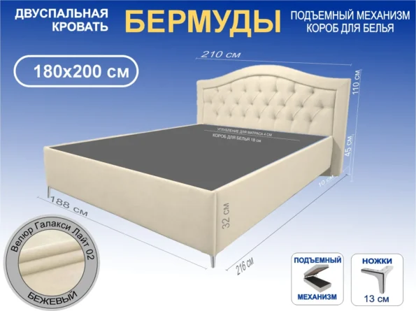 В наличии Кровать Бермуды, 180×200, Подъемный механизм полное дно с полкой, Велюр Галакси лайт 02-бежевый, Ножки 13 см угловые хром Чехол на царгах НЕ съемный.
